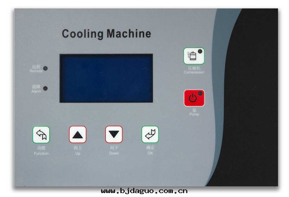 按鍵功能(néng):菜單按鍵,增加或(huò)翻页按鍵,減少(shǎo)或(huò)翻页按鍵鍵,确認按鍵,開(kāi)機(jī)/水(shuǐ)泵按鍵,壓缩機(jī)按鍵